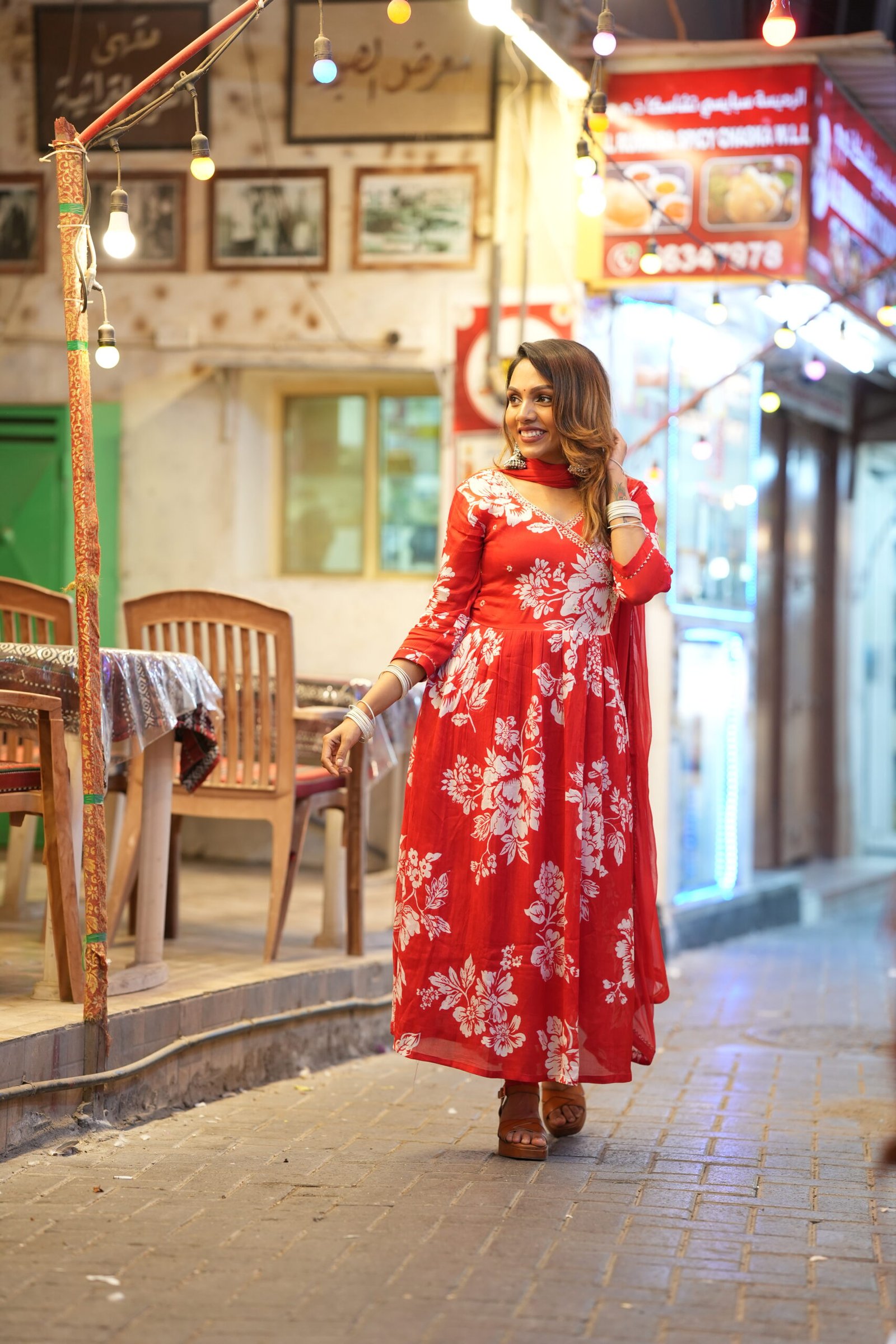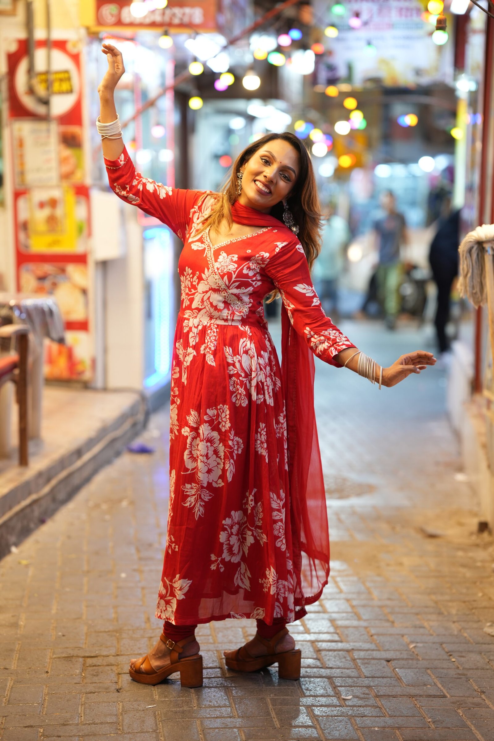 Soft Crepe Kurta Set – Red Floral Kurta in Aalia Cut with Solid Pant and Dupatta.